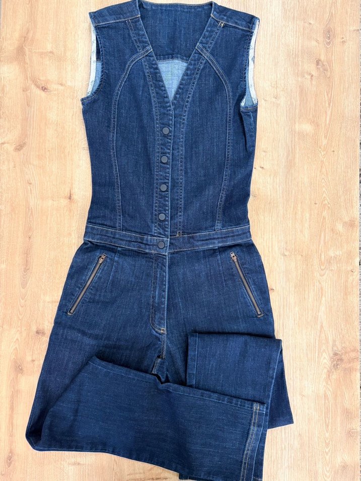 Kadınlar için kolsuz, V yakalı, kemerli lacivert denim tulum. Normal kesim ve midi boyda, günlük rahat kullanıma uygundur.