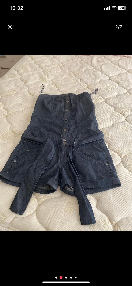 Kemerli, askısız ve kolsuz lacivert denim mini tulum. Önden düğme detaylı, rahat ve şık günlük sokak stili için uygun.