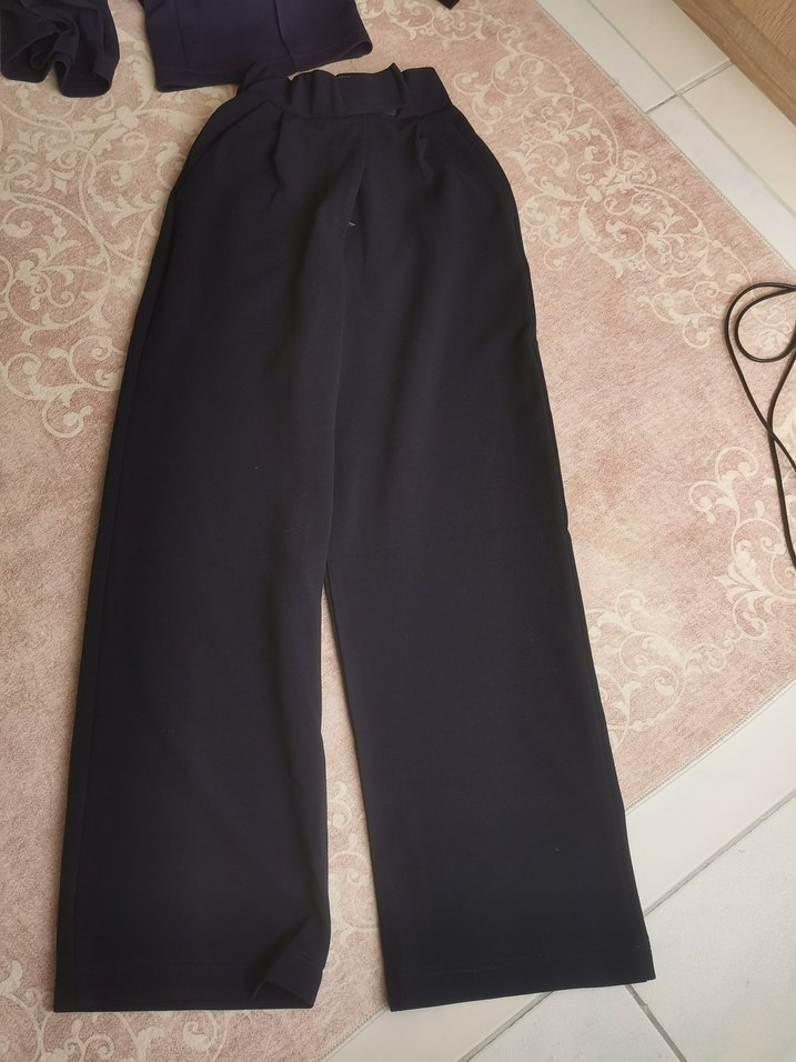 Siyah, kemerli, uzun kesim kadın pantolonu, sentetik kumaştan, ofis kullanımı için uygun. Belini yaptırdım 40 kilo olan birine olur
