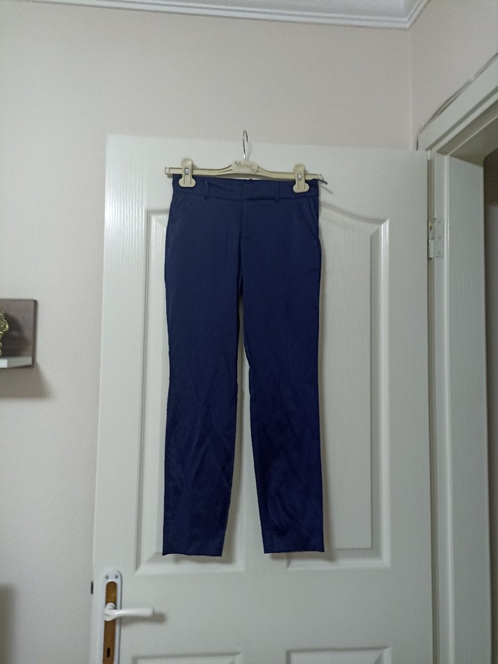 Kadınlar için koyu mavi kumaş pantolon, normal boy ve regular fit. Kemerli, desensiz, minimalist ve normcore tarzda, ofis kullanımı için uygun. Bel ölçüsü 35 uzunluğu 87