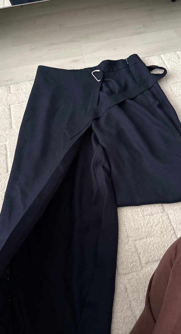 Kadınlar için lacivert, kemerli ve düzenli kesime sahip, ipeksi kumaştan yapılmış kumaş pantolon.