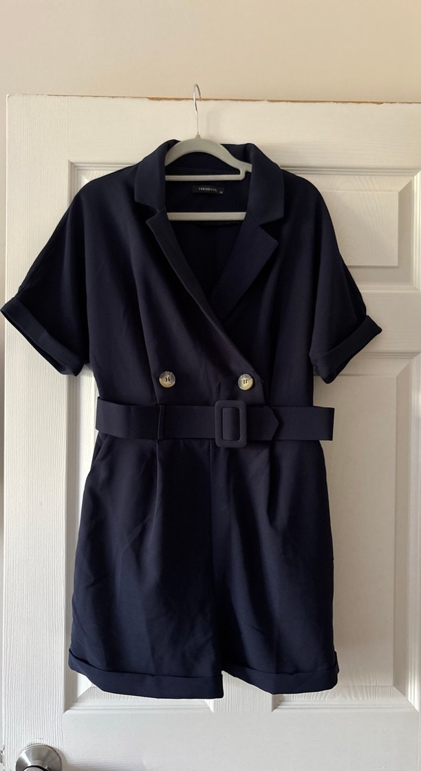 Lacivert kısa kollu, kemerli midi tulum. Notch yaka ve regular fit ile ofis için uygun, Paris sokak modası tarzında sentetik kumaş.