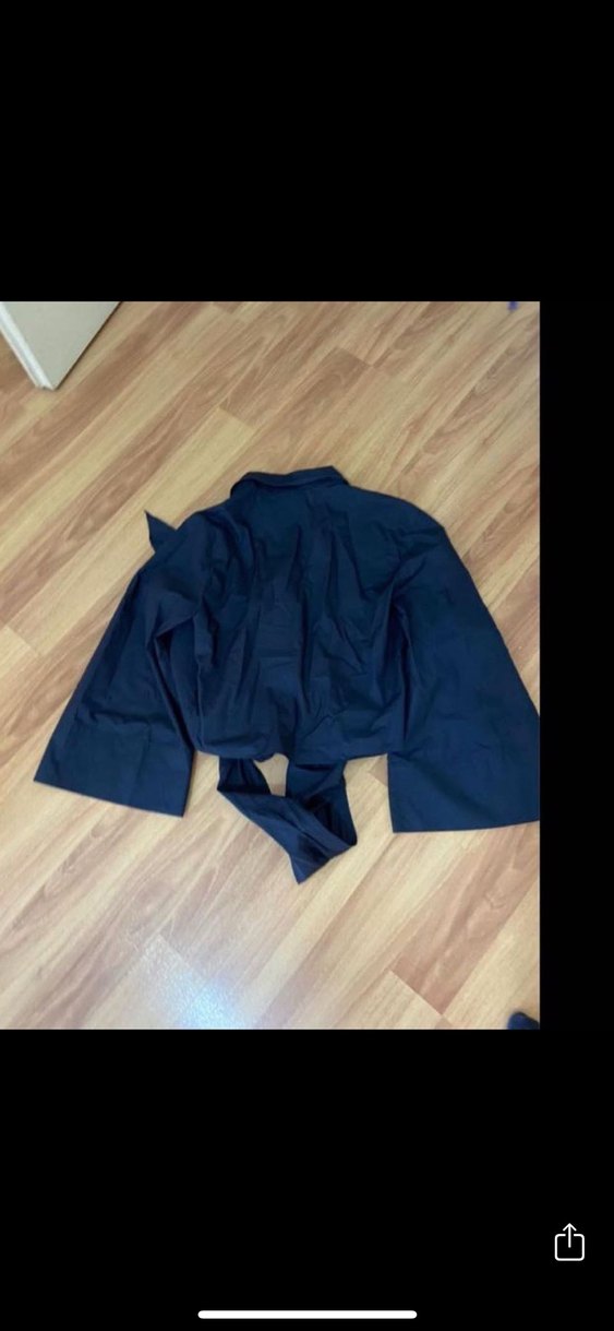Kadınlar için bol kesim, uzun kollu, boğazlı ve kemerli kısa boy mini gömlek. Lacivert renkte, ofis kullanımına uygun sentetik kumaştan.