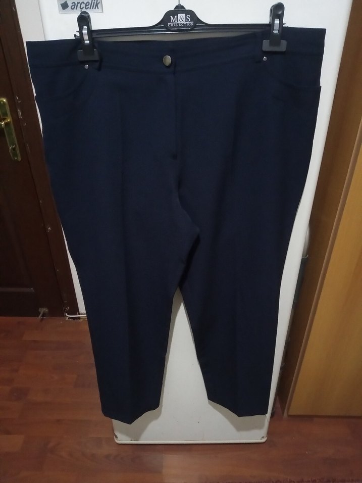Kadınlar için koyu lacivert kumaş pantolon, düzenli kesim ve normal boyda. Kemerli bel ve desensiz sade tasarım, ofis için uygun. ✨