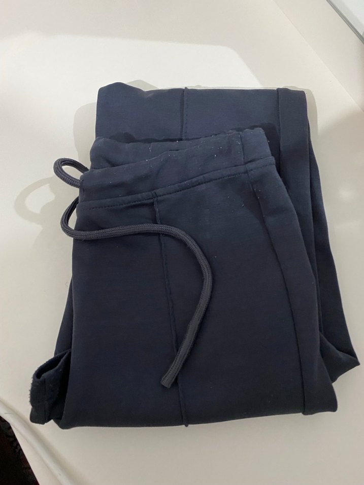 Kadın lacivert kemerli eşofman, fitted kesim ve yumuşak sıcak kumaş ile günlük streetwear görünüme uygun midi boyda.