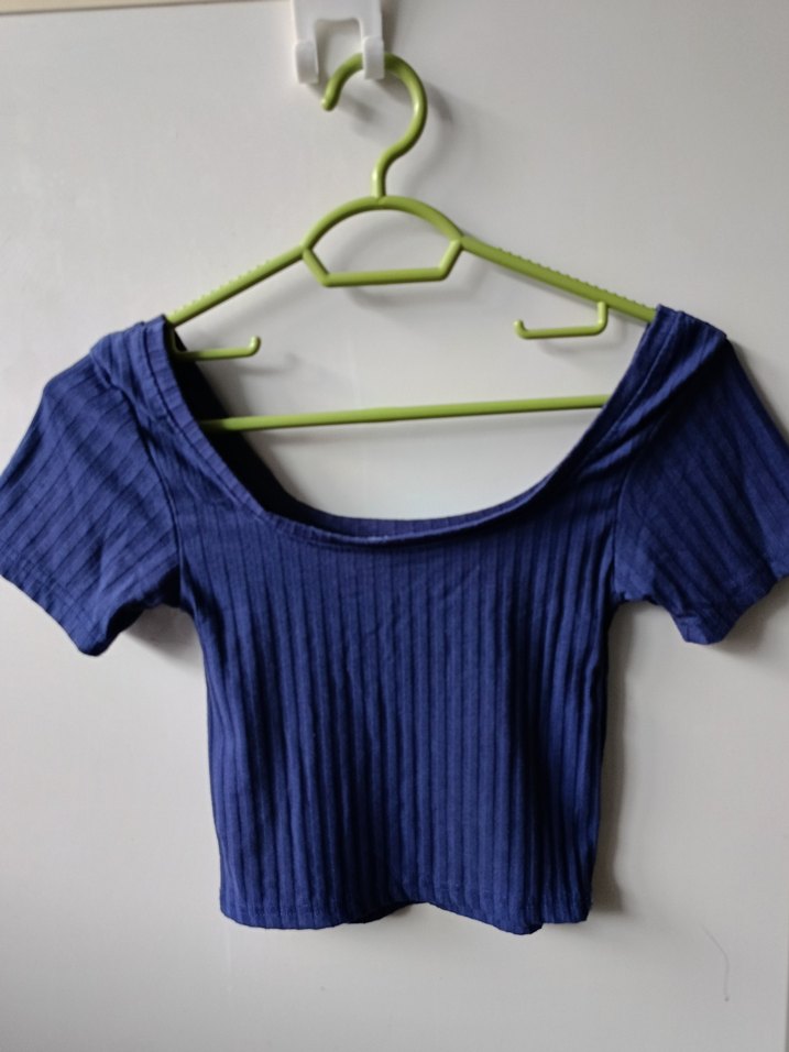 Keten kumaştan, kısa kollu ve kayık yaka lacivert kadın crop top. Bedenine oturan, pileli tasarımıyla günlük kullanıma uygundur.