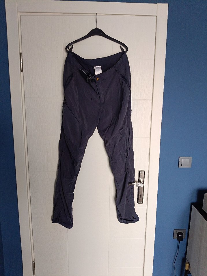 Kadınlar için kemerli, rahat kesim, midi boy lacivert keten pantolon. Sokak modası ve açık hava için uygun, şık ve konforlu bir tasarım. çok küçük bir yırtığı var