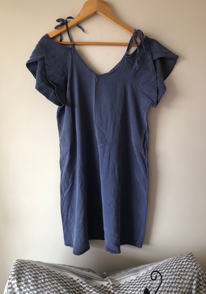 Kadın lacivert keten elbise, V yaka, kısa fırfırlı kollu ve bol kesim midi boyda, minimalist bohem tarzda. Günlük kullanıma uygun.