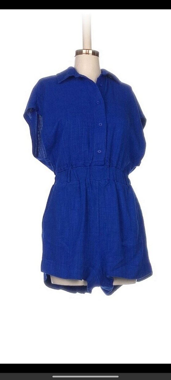 Düğmeli ön kısmı ve yakalı kısa kollu, rahat kesim lacivert keten mini tulum, sade ve bohem tarzda. marka temsili