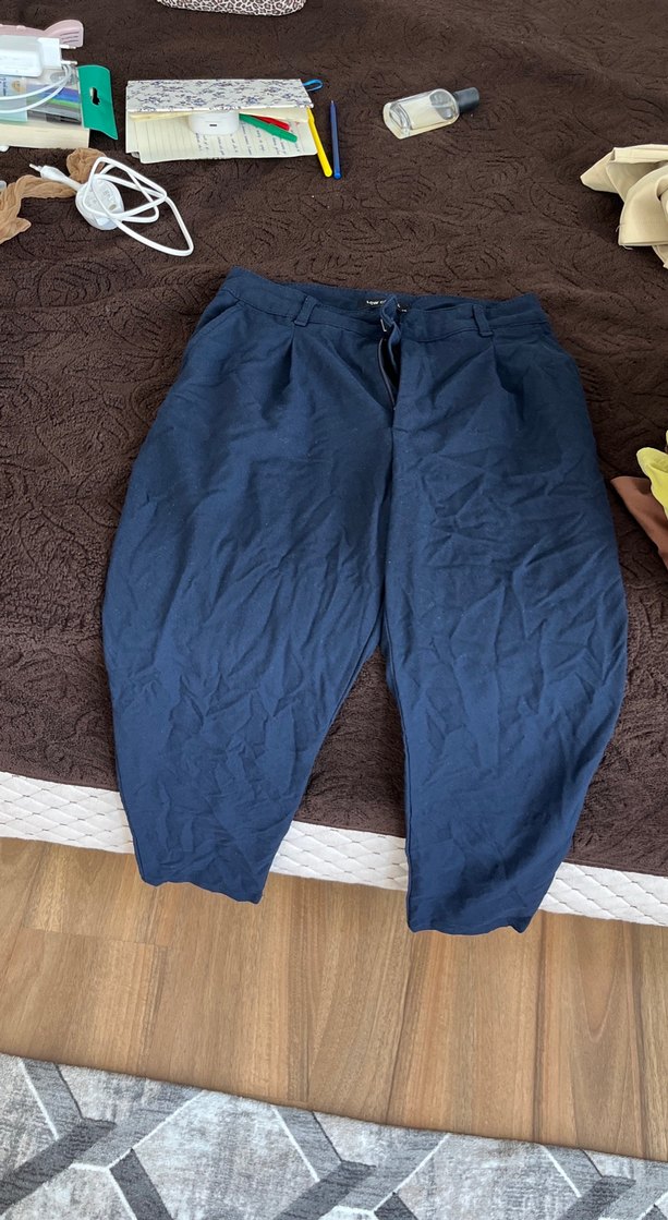 Kadınlar için keten kumaştan, rahat kesim ve midi boyda, koyu mavi renkte, günlük kullanıma uygun sade ve şık pantolon.
