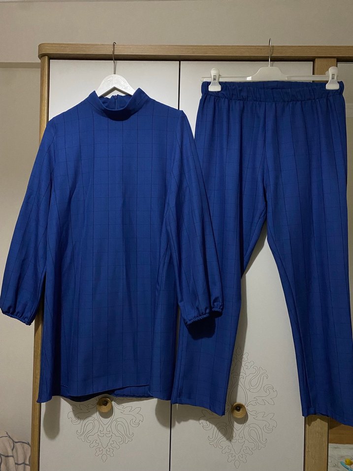 Kadın keten takımı, yüksek yakalı, uzun kollu ve pilili tasarıma sahiptir. Lacivert renkte, normal boyda ve regular fit kesimdedir.