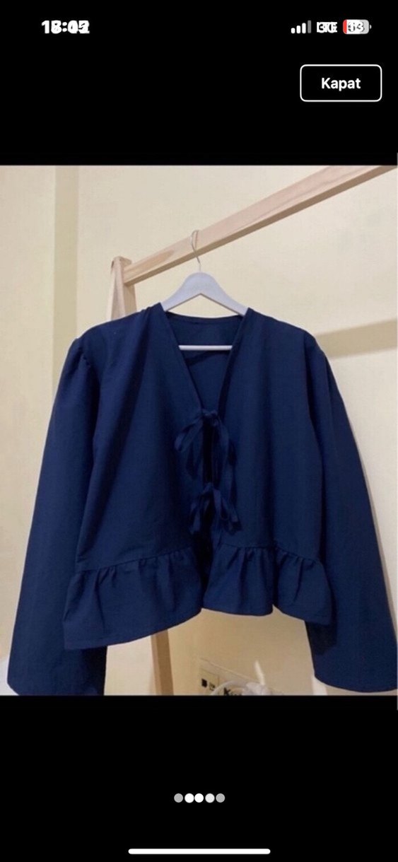 Kadınlar için uzun kollu, V yaka ve volan detaylı keten ceket. Bol kesim ve koyu lacivert renkte, minimal ve rahat tarz için uygun.