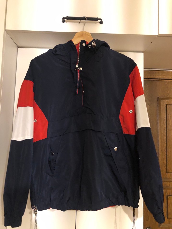 Kadın sweatshirt ceket, bol kesim ve uzun kolludur. Lacivert renkli, kırmızı ve beyaz detaylıdır. Kapüşonlu ve ceplidir, dış mekan kullanımı için uygundur. Lastik kısmında yıpranma var resimlerde görünüyor