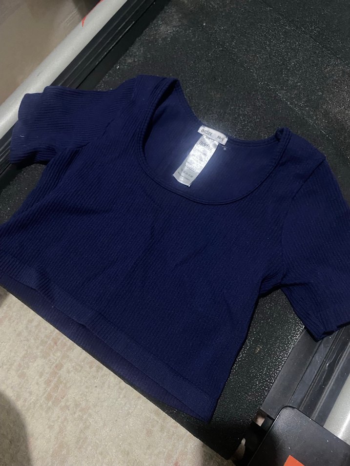 Addax lacivert, kısa kollu, yuvarlak yakalı, vücuda oturan crop top. Sentetik kumaştan, desen içermeyen rahat bir dış mekan parçası.