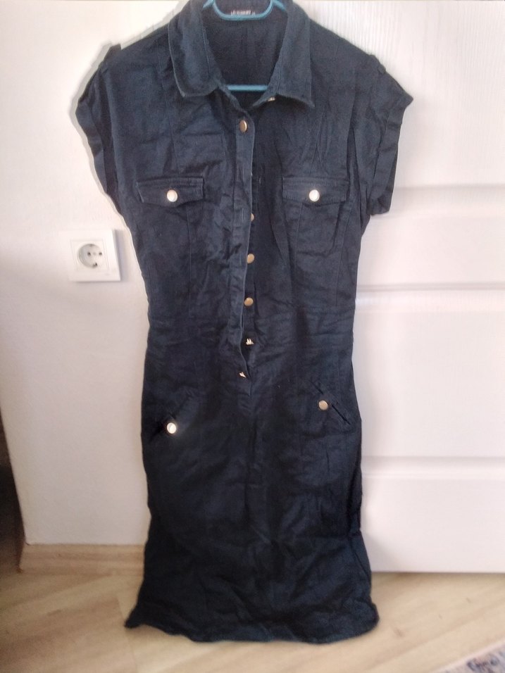 Düğmeli, kısa kollu ve yakalı bu lacivert uzun denim elbise, günlük rahat sokak stili için uygundur.