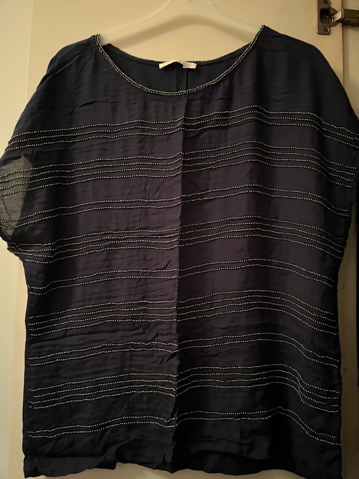 Lacivert renkli, kısa kollu, yuvarlak yaka keten kumaştan yapılmış, bol kesim kadın bluzu. Minimalist normcore tarzıyla günlük kullanıma uygundur.
