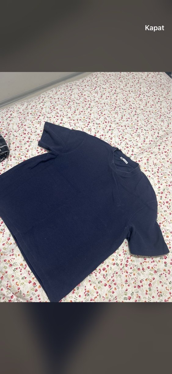 Kadınlar için kısa kollu, yuvarlak yakalı, bol kesim pamuklu tişört. Normal midi uzunlukta, düz koyu mavi renkte, rahat sokak stili için uygun.
