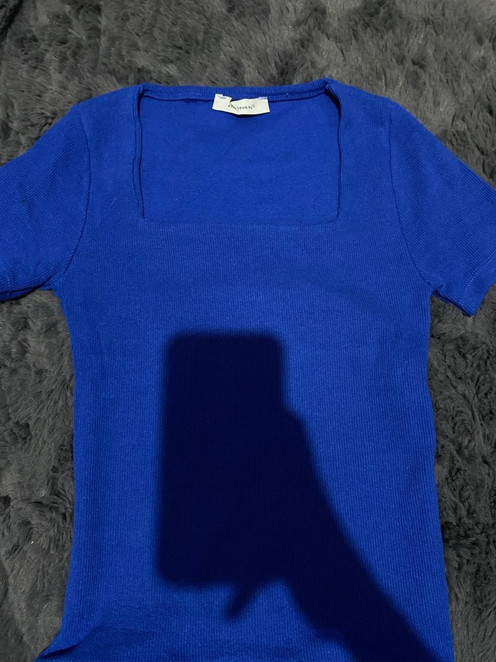 Kadınlar için kısa kollu, kare yakalı, lacivert renkli, yumuşak ve sıcak kumaştan yapılmış, günlük sokak giyimine uygun dar kesim tişört. Hiç giymedim