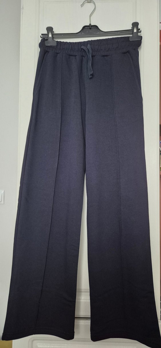Kadınlar için lacivert renkli, klasik kesim, pilili ve yumuşak, sıcak kumaştan yapılmış eşofman tarzı pantolon. Midi boyda, spor ve rahat sokak stili için uygundur. Ölçüleri ve uzun açıklama görsellerde mevcut.