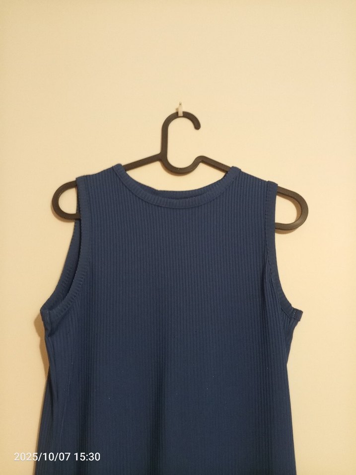 Düz lacivert renkli, kolsuz ve yuvarlak yakalı, vücuda oturan normal boyda kadın elbise. Pürüzsüz sentetik kumaştan, günlük kullanıma uygun tarzda.