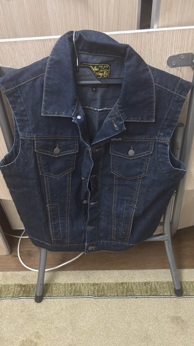 Koyu mavi renkli, kolsuz denim biker kot yelek, düğmeli ve kesimli yaka detaylı, günlük kullanıma uygun geniş kesim.
