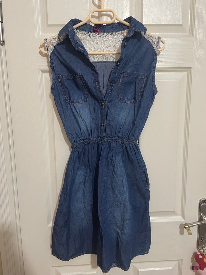 Lacivert kolsuz kot elbise, yakalı ve kemerli, vücuda oturan kesim ve batik desenli. Günlük kullanıma uygun şık tasarım.