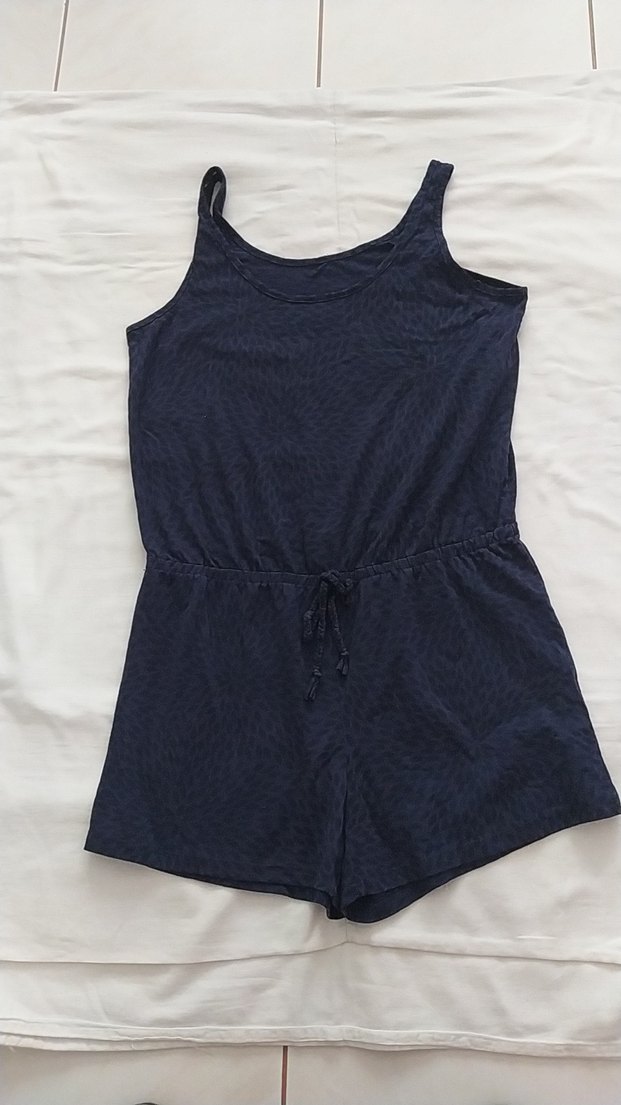 Lacivert kolsuz tulum, yuvarlak yaka ve bağcıklı bel ile rahat kesim. Yumuşak sentetik kumaştan, dış mekan için uygundur.