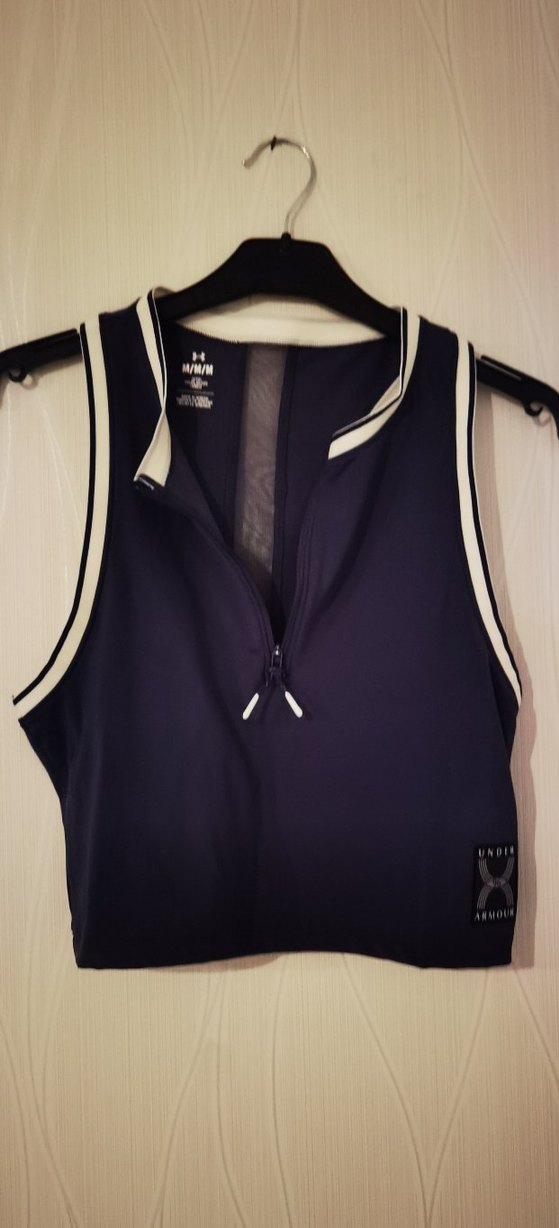 Lacivert renkte, sentetik kumaştan üretilmiş, kolsuz ve yüksek yakalı, fermuarlı kısa kesim kadın spor tişörtü. Spor ve sokak stiline uygun sade tasarım.