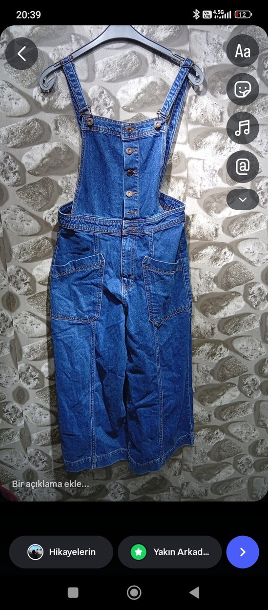 Lacivert kot kumaştan, askılı ve kemerli, bol kesim tulum. Önde düğmeler ve büyük cepler bulunur. Günlük sokak stili için uygun.