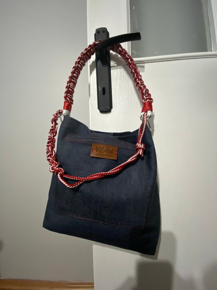 Kadınlar için lacivert kot kumaştan yapılmış, kemer detaylı ve gri baskılı desenlere sahip çanta. Sokak modasına ve günlük kullanıma uygundur.