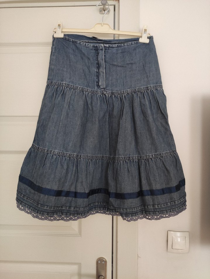 Kadın lacivert midi uzunluğunda, bol kesim, fırfırlı katmanlara sahip yumuşak denim kumaştan yapılmış vintage bohem tarzda etek. Düz ve gri tonlarda, uç kısmında dantel detaylı.