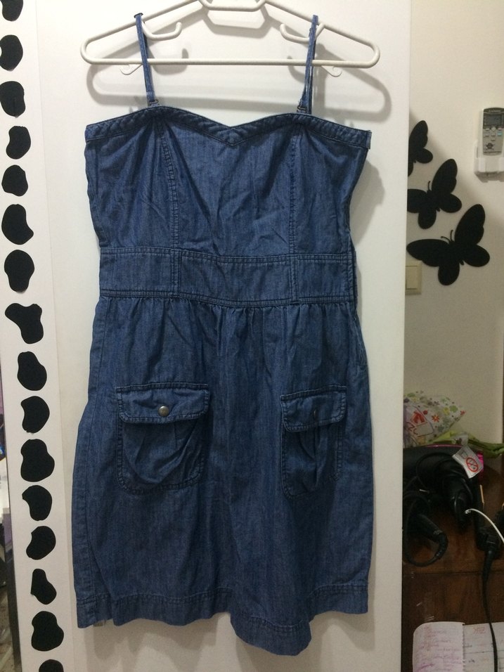 Lacivert kot kumaştan, ince askılı, kemerli ve cep detaylı midi elbise. Rahat ve şık günlük kullanım için uygun.