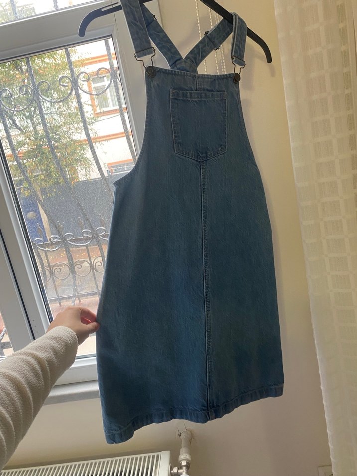 Lacivert kot midi tulum, tokalı askılar ve yüksek yakaya sahip, bol kesim ve günlük rahat sokak stili için uygun.
