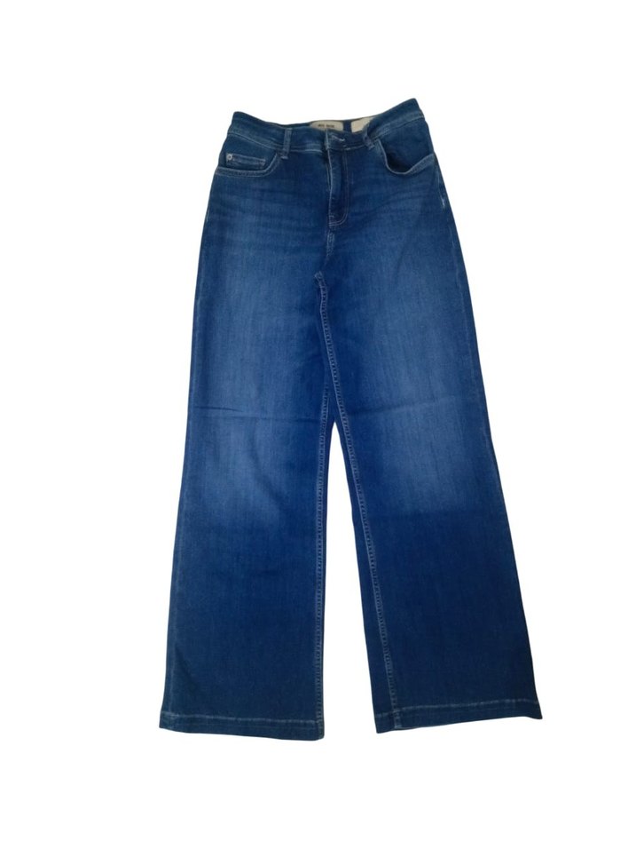 Kadınlar için lacivert kot pantolon, bol paça kesim. Desen içermeyen sade tasarıma sahip, günlük kullanım için uygundur. Beden 27/32