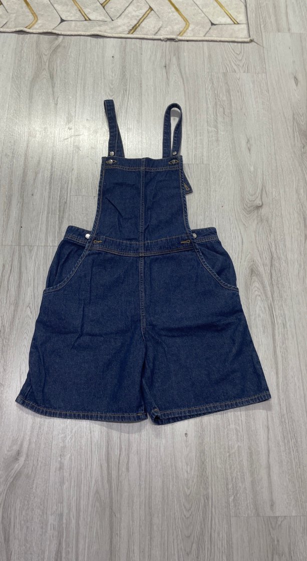 Lacivert kot kumaştan, bol kesim, askısız yaka ve kemerli bel detayına sahip kadın şort tulum, günlük rahat stil için uygundur.