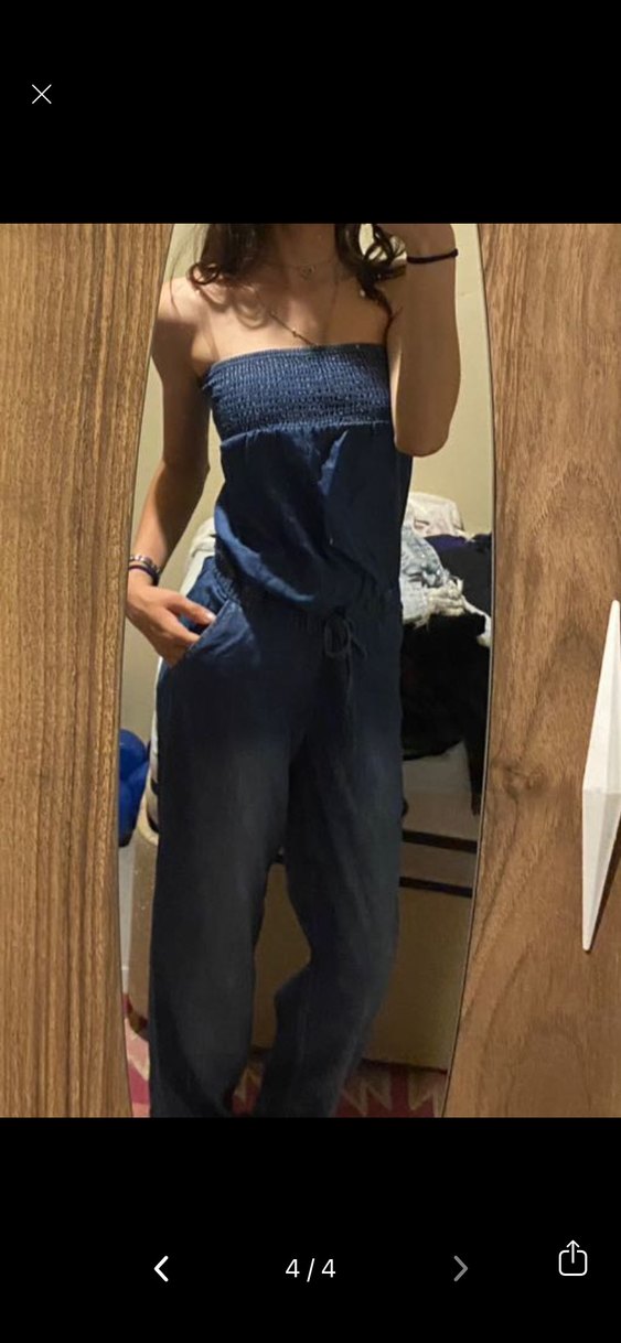 Lacivert kot kumaştan, straplez yakalı ve kemerli, rahat kesim midi boy tulum. Günlük sokak stiline uygun, askılı kollu model.