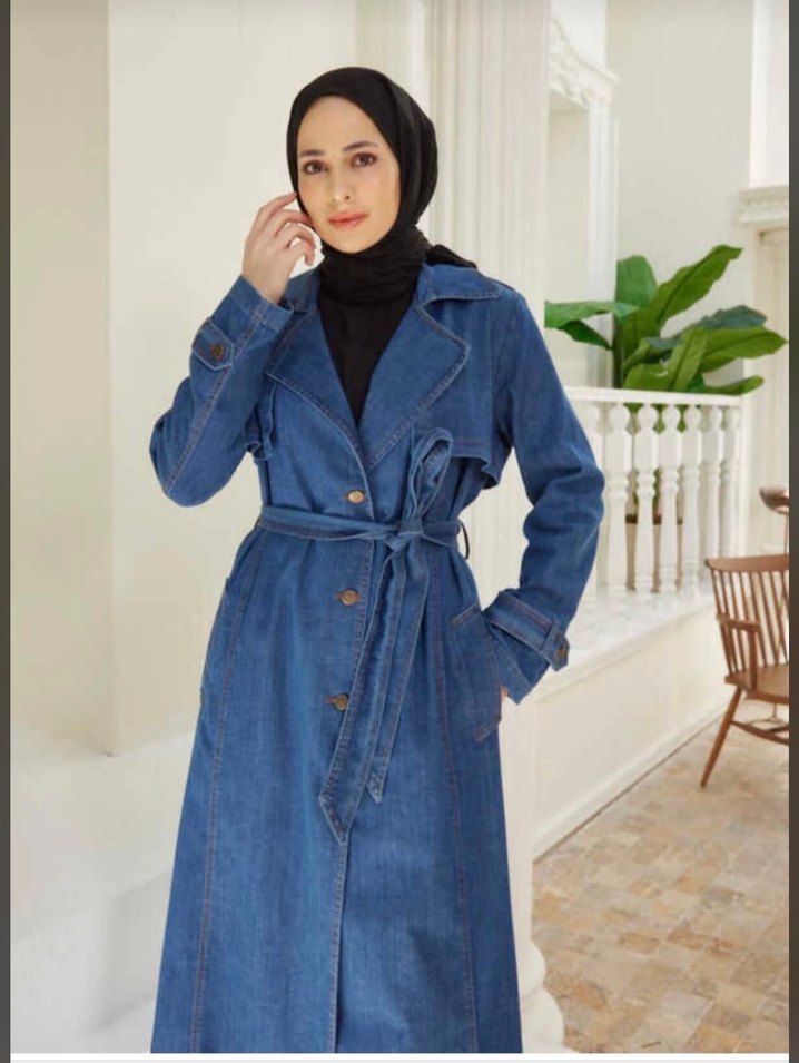 Kadınlar için lacivert kot kumaştan, uzun kollu ve kemerli, regular fit trençkot. Günlük sokak stiline uygun.