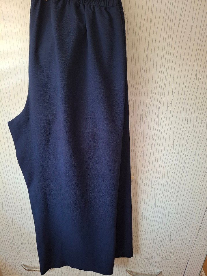 Kadınlar için uzun boy, regular fit, sentetik kumaştan yapılmış parlak lacivert pantolon. Günlük kullanıma uygun. 7xl.