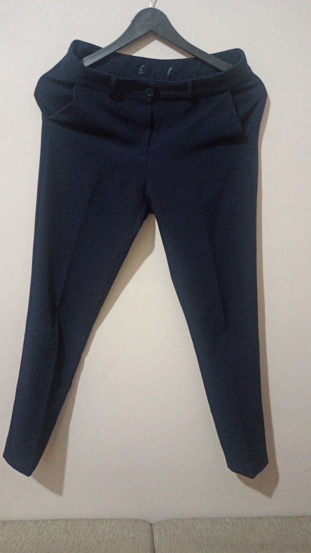 Lacivert renkte, regular fit midi boy kadın kumaş pantolon. Düz, sentetik kumaştan, ofis ve günlük şıklık için uygundur.