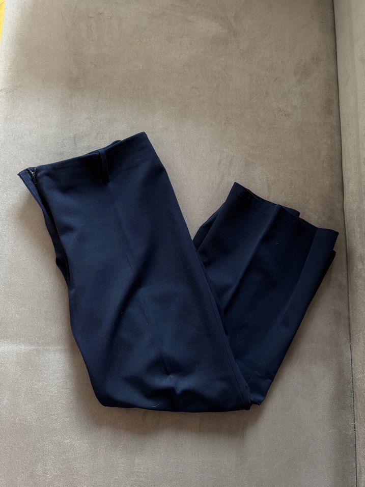 Kadınlar için midi boy, regular fit lacivert kumaş pantolon. Düz ve sade tasarımla ofis için uygun minimalist stil sunar.
