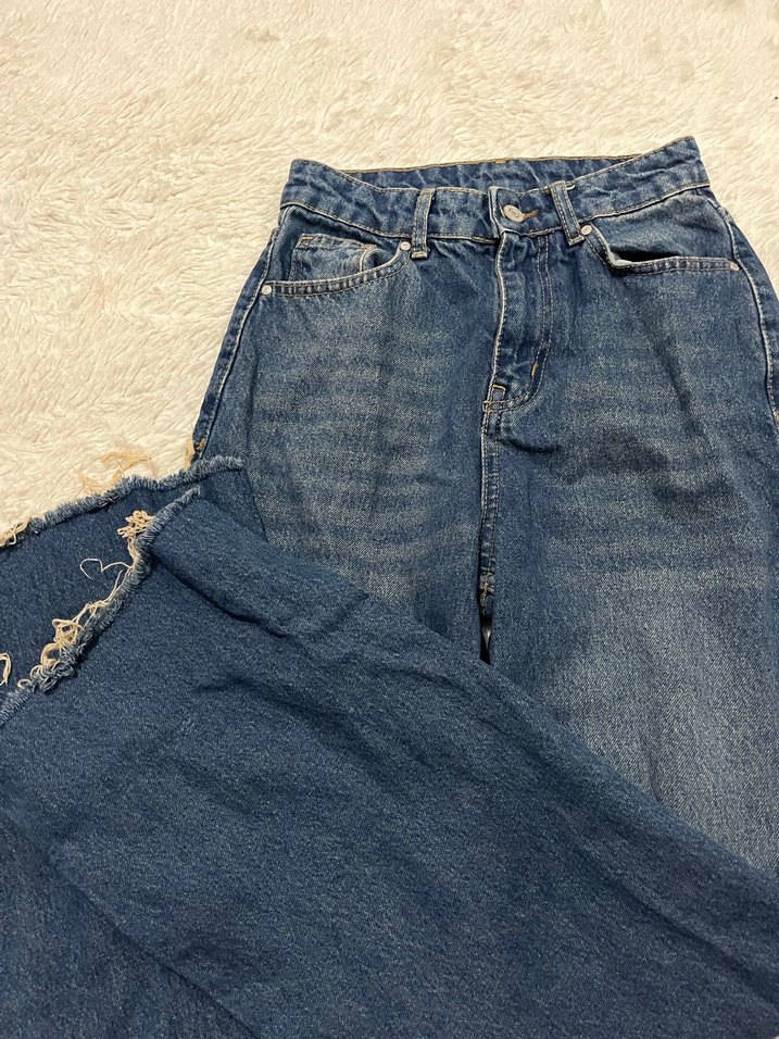 Lacivert parlak denim kumaştan, bol kesim ve midi boy kadın pantolon. Kürk detaylarıyla günlük rahat kullanıma uygun.