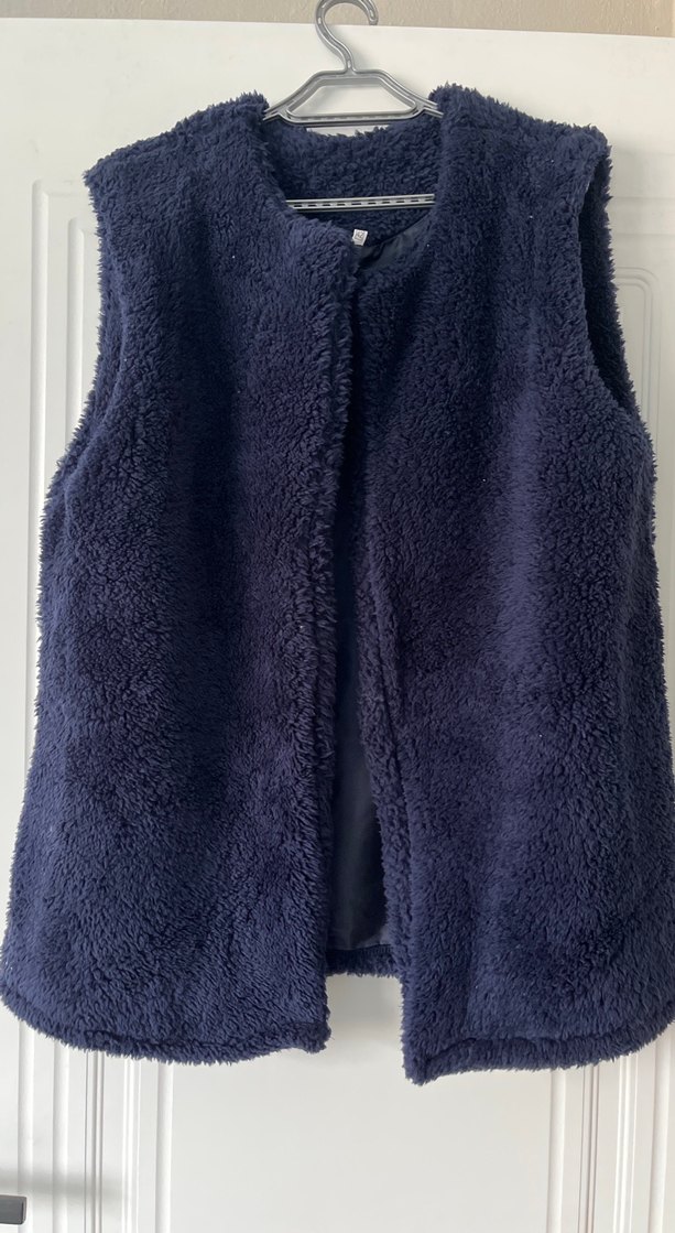Kolsuz, yumuşak kürk detaylı lacivert yelek. Notlu yaka ve normal midi boy kesime sahip, gündelik kullanıma uygundur.