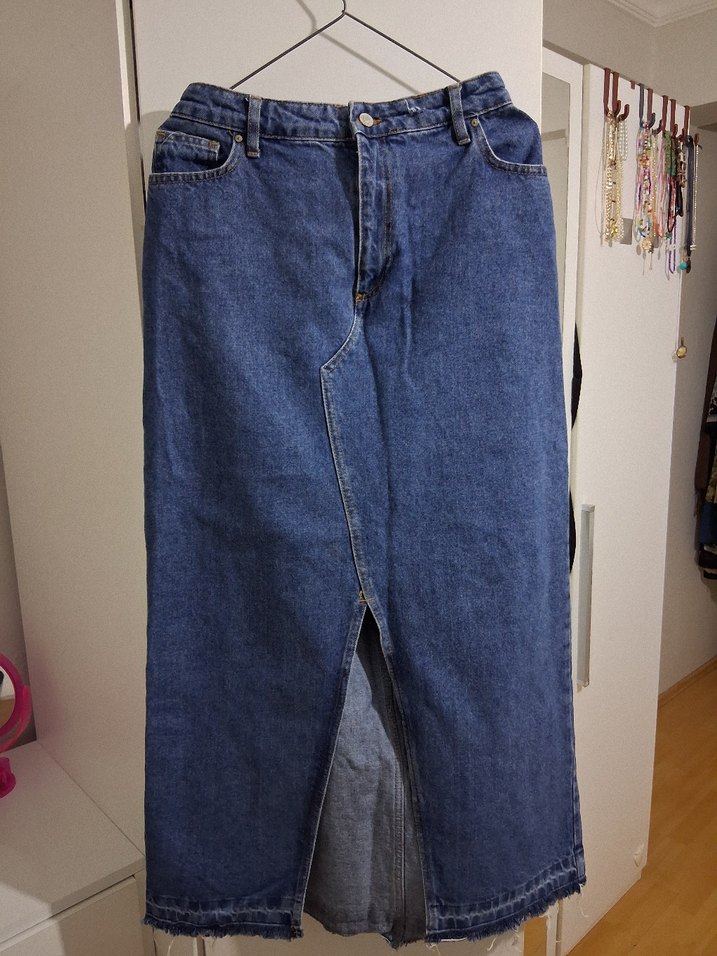 Kadınlar için lacivert renkte, bol kesim ve önü yırtmaçlı maxi uzunlukta denim etek. Günlük kullanıma uygun rahat ve normcore tarzda. Kot kumaşı olduğu için esneme payı mevcut, 2 defosu var fotoğraflarda belirttim fiyat bu yüzden uygun, daraltma işlemi geçirmiş ama elle dikiş yapılmış pens atılmış ama dikiş makinesi kullanılmamış elle bile sökülebilir, düğmedende daraltma yapılamamış bunun yerine yanına delik açılmış kemerle veya el dikişiyle bile kapatılabilir.42 beden yazıyor etiketinde fakat belden daraltıldığı için şu andaki ölçülerini yazıyorum. uzunluğu 98 cm, yırtmacın uzunluğu 43cm işlem görmüş haliyle şu an bel uzunluğu 38 cm.