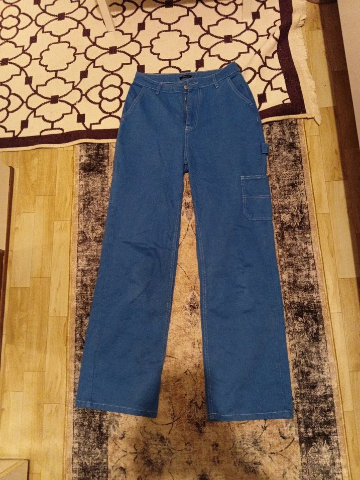 Lacivert kot pantolon, bol kesim ve midi boyda, sokak stiline uygun rahat ve şık bir görünüme sahiptir. Günlük kullanım için idealdir.