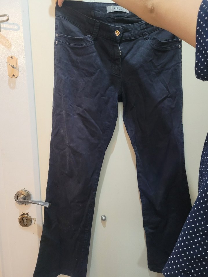 Lacivert kot pantolon, midi boy ve regular fit. Kemerli ve desensiz, günlük sokak stiline uygun.