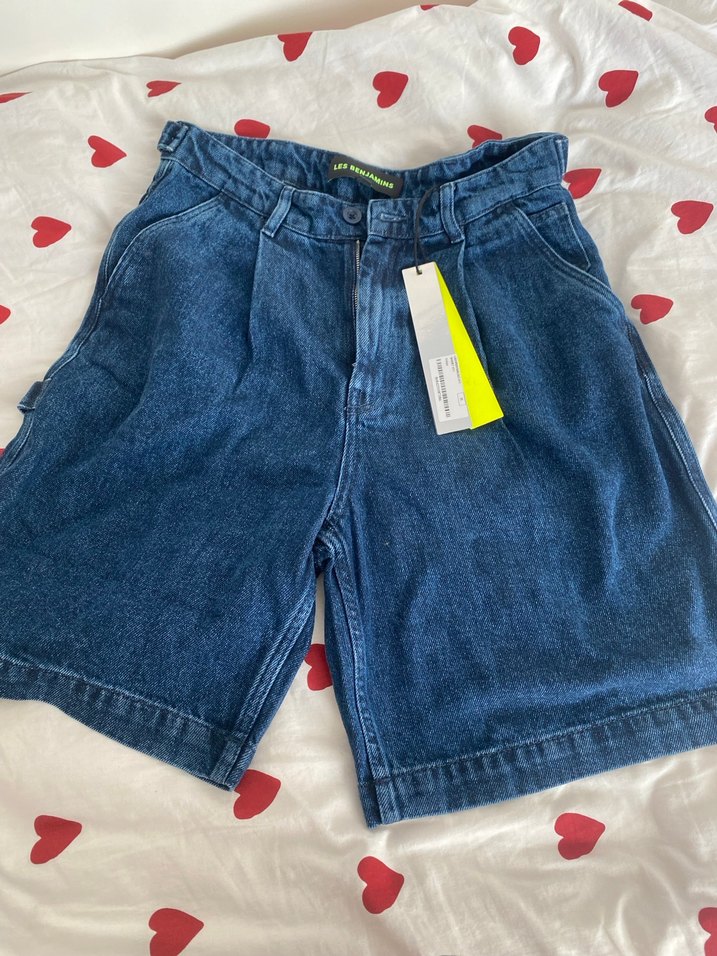 Kadınlar için lacivert renkte, düğmeli, bol kesim midi uzunluğunda denim şort. Günlük kullanıma uygun rahat sokak stili.