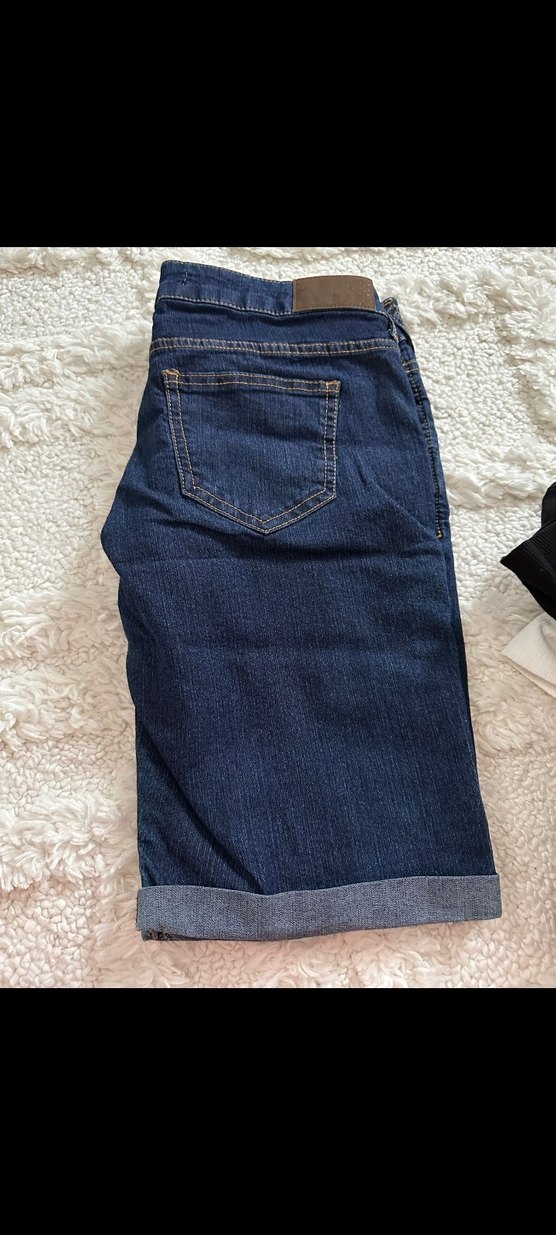 Lacivert midi boy, kemerli, normal kesim kadın denim şort, günlük kullanıma uygun. ✨
