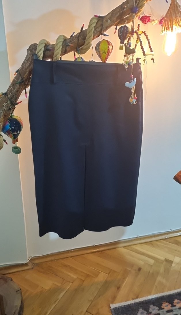 Kadınlar için lacivert midi kalem etek, regular fit ve kemer detayına sahip. İpeksi dokusuyla ofis ve günlük kullanıma uygun.