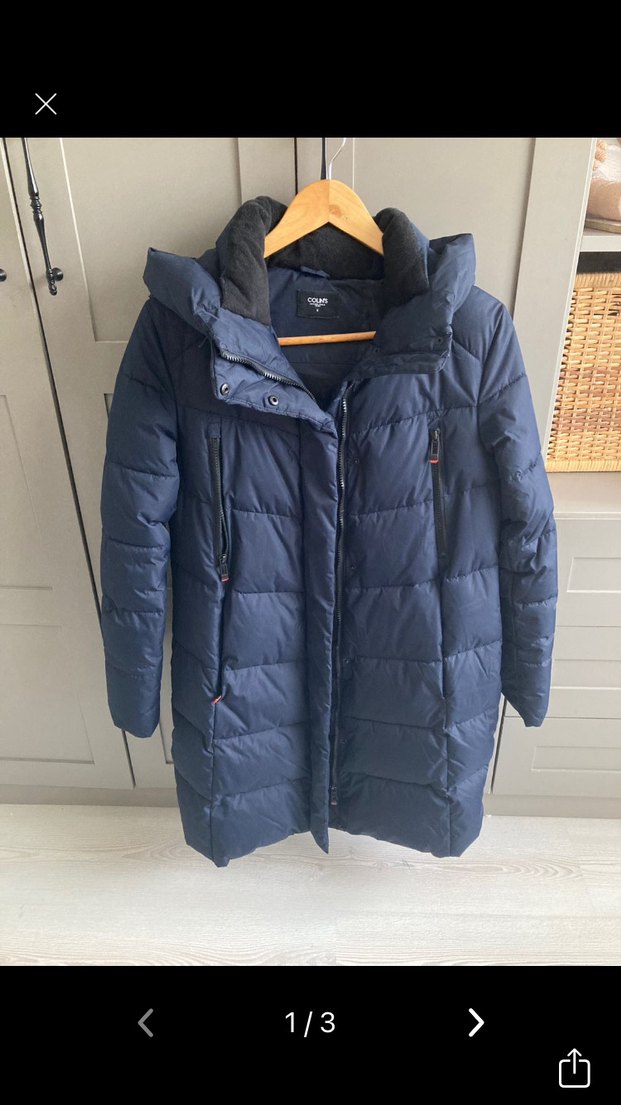 Kadınlar için fermuarlı, yakalı ve uzun kollu midi uzunlukta lacivert kaban. Yumuşak ve sıcak kumaştan . Yeni gibi tam kışlık mont
