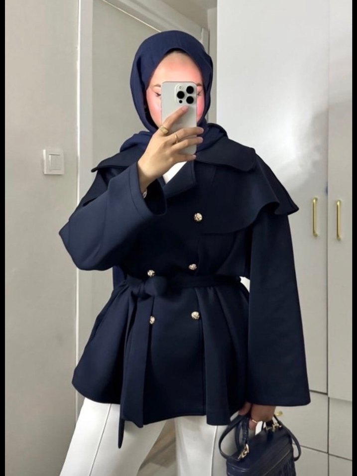 Lacivert midi uzunlukta, kemerli, notched lapel yakalı ve uzun kollu kadın trençkot. Düzenli kesim ve yumuşak, sıcak kumaştan üretilmiştir.